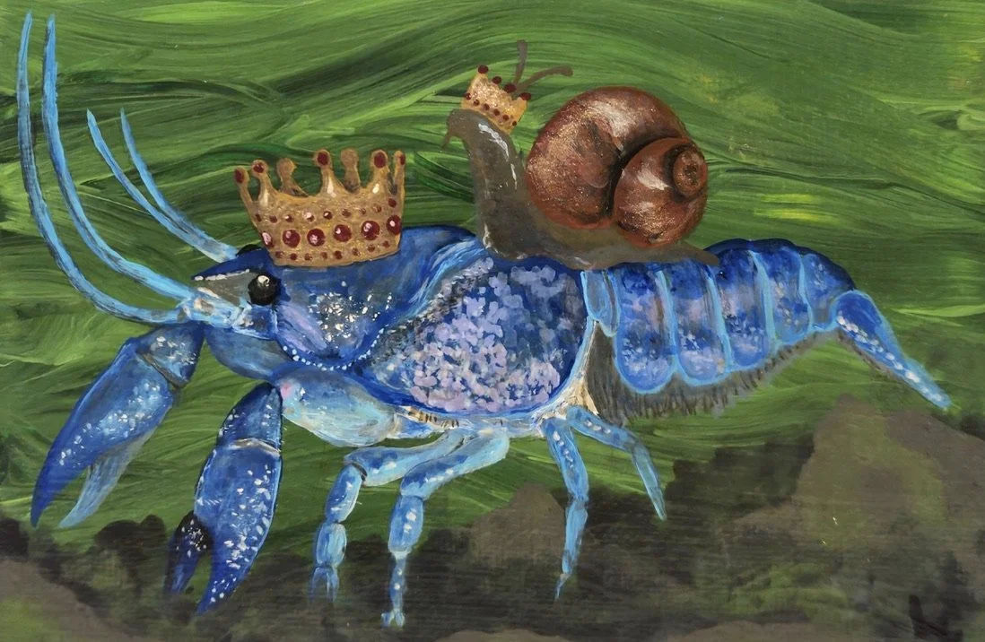 King Crayfish and Snail - 4x6" acrylic on canvas board, 2023