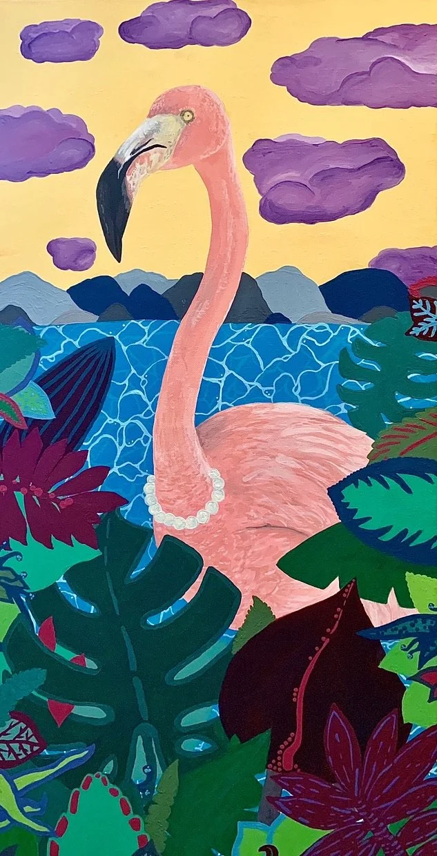 June the Flamingo - 15 x 30" acrylic on stretched canvas, 2021