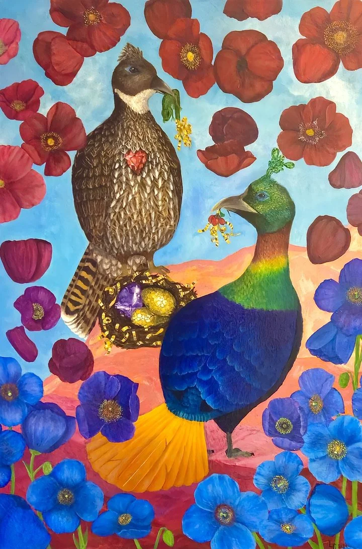 Himalayan Monal Pheasants with Poppies - 24 x 36", acrylic on stretched canvas, 2024